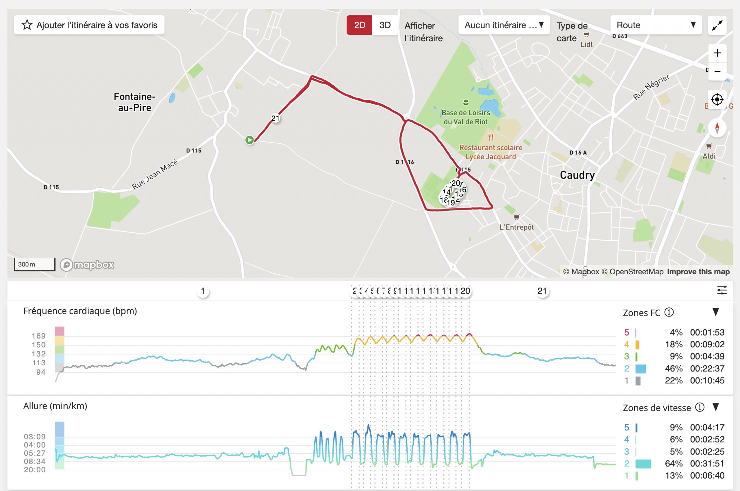 Même type de séance avec un peu plus de séries et une récupération au chrono pour une séance cible en zone 4 (Attention problème de la ceinture cardio au début).